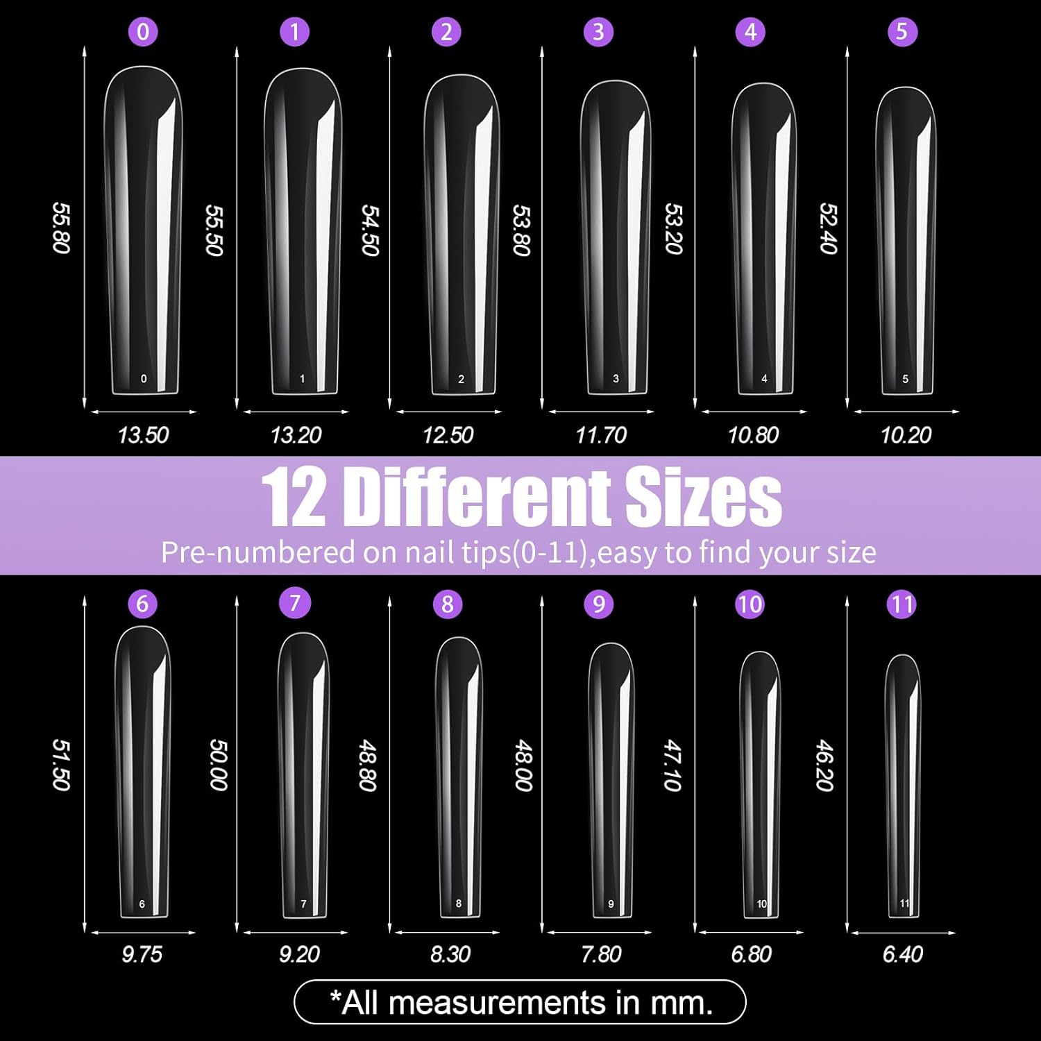 A pack of 240 full-cover false nail tips made of soft-gel (or gel-like) material. They come in 12 different sizes to fit a variety of nail beds. The nails feature a long square shape with straight, clear tips, ideal for creating salon-style full-coverage extensions. They’re designed to be easy to apply using nail glue (or gel/acrylic systems), and once applied and shaped you can paint, polish, or add nail art as you like.
